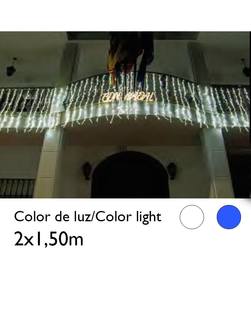 Cascade curtain of LED lights for professional use, cool white or blue light color, transparent cable, suitable for outdoor & indoor applications. It measures 2 meters long by 1.5 meters high. It has 16 numbers of strips of 48 LEDs with a total of 768 Led lights. Being LED, it consumes only 35W. Power 1,5m cable & plug included.