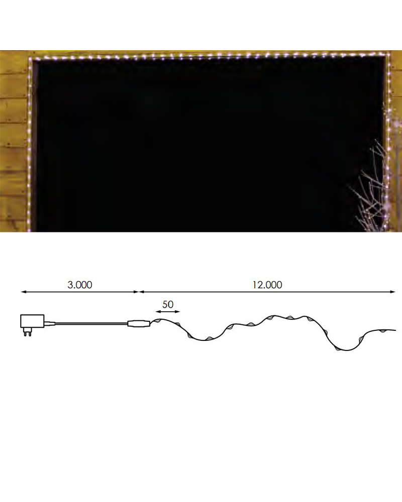 Measurements: length of 12 meters Lamps: composed of 216 LED lights Total consumption: only 6W For indoor use, IP20.