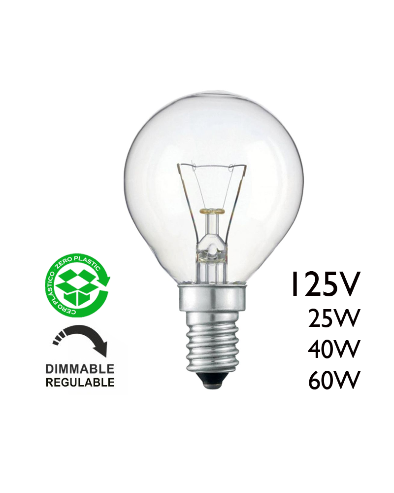 Low voltage 125V clear glass round incandescent lamp with E14 socket. Available in different powers.