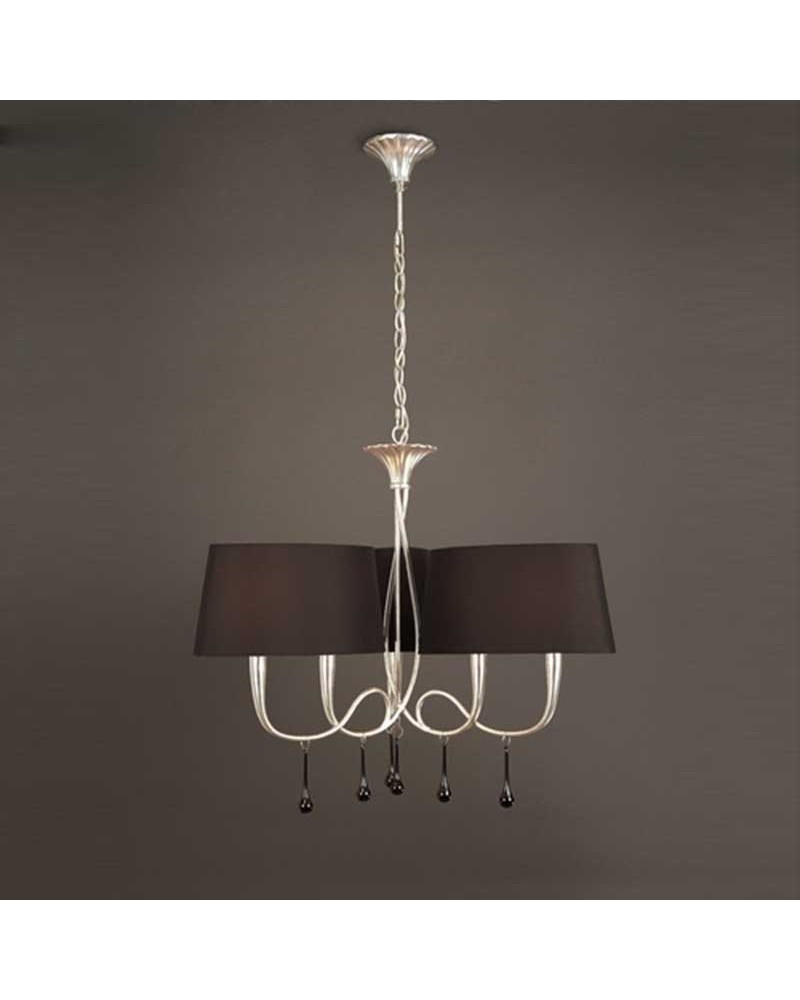 77cm diameter ceiling lamp. It is composed of 3 fabric lampshades in a black finish and a silver base. This sophisticated lamp includes 6 E14 sockets, designed for bulbs with up to 20W maximum power each. So you can choose the color of the light you want according to your preferences (Bulbs not included).