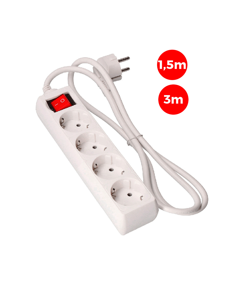 Power strip with 4 Schuko sockets with switch and 3x1.5mm2 cable available in 1.5m or 3m cable length.