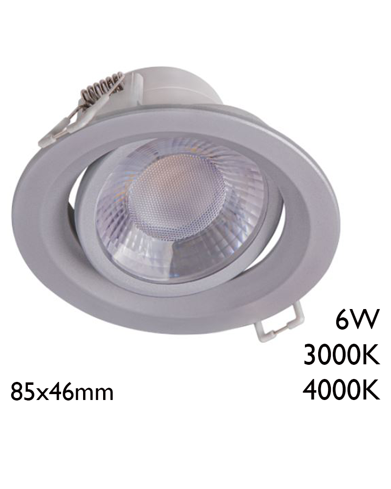 Grey downlight with round frame 6W tilting. Available in 3000K and 4000K color temperature. Cutting hole 7cm.