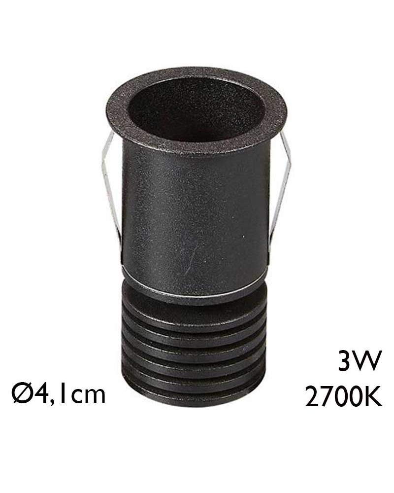 3W recessed LED downlight made of aluminum, available in white or black finish. Warm light 2700K. With measurements of Ø4.1x6.8mm. Cutting size: Ø35mm. Long life of 30,000 hours. Suitable for outdoors due to its IP54 protection.