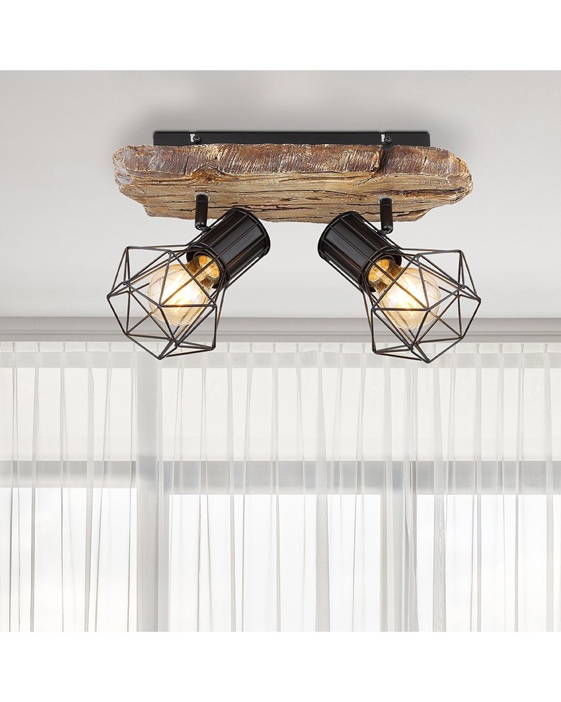 Industrial vintage ceiling strip with 2 oscillating spotlights, black lampholder finish, imitation wood base, 2xE27 60W