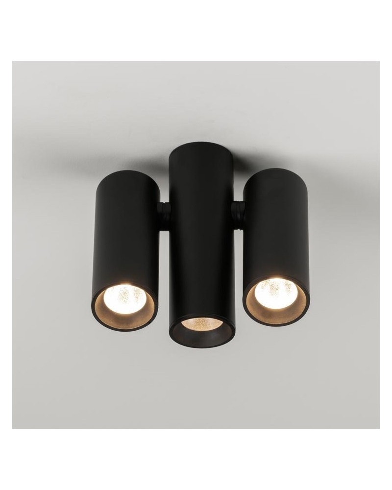Foco triple en forma de cilindro, disponible en Negro, Blanco con LED incorporado. Cuerpo fabricado en Acero. Versatilidad de alta calidad para cualquier ambiente. Un foco es fijo y los de los laterales son oscilantes. Fabricado en España.