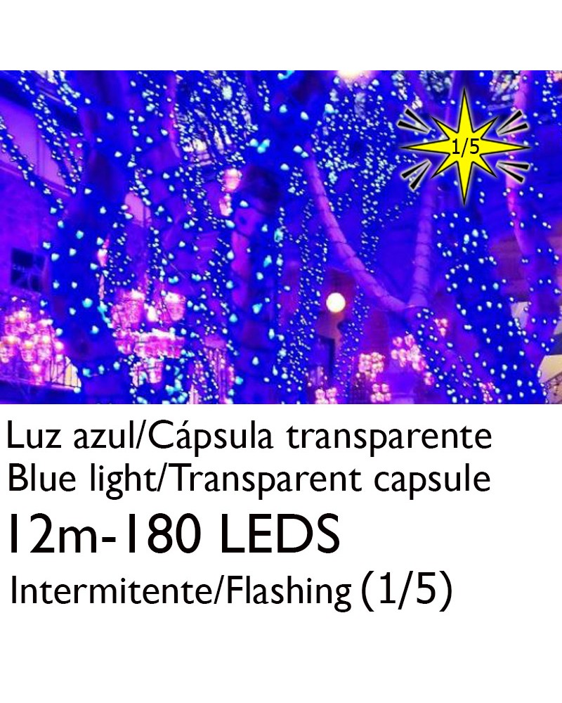 Guirnalda de 12 metros de longitud, empalmable, con 180 luces LED efecto intermitente, cápsula clara, con luz y cable color azul. Se puede empalmar hasta 10 cortinas (100 a 120 metros en total) con un solo enchufe. Está formada por 3 segmentos de 4m con 60 leds (50 luz fija y 10 luz intermitente), que pueden funcionar de forma independiente.