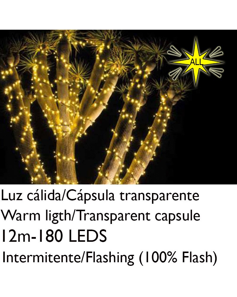 Guirnalda 12m y 180 LEDs Intermitente luz cálida cápsula clara cable verde o blanco empalmable IP65 apta para exterior