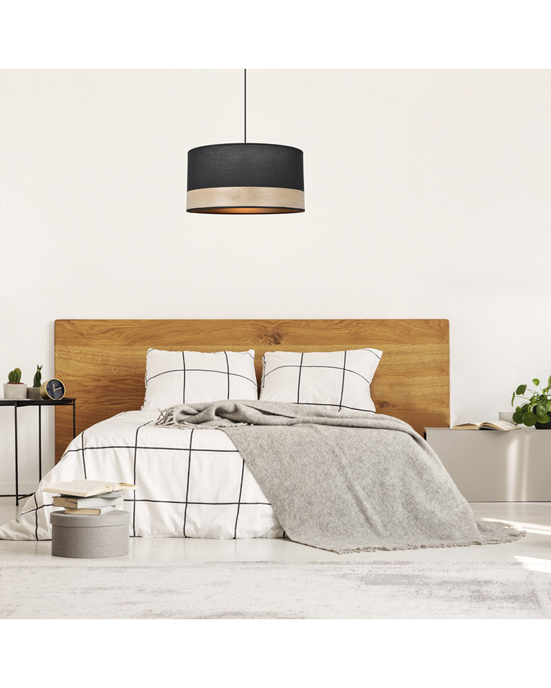 Lámpara colgante circular moderna y decorativa. Pantalla fabricada en algodón con una franja decorativa efecto madera. Disponible en acabados blanco o negro. Para cualquier estancia como dormitorios, salones, restaurantes, comedores.... La luz al atravesar los distintos materiales genera un efecto visual muy delicado y elegante. Fabricado en Europa. Bombilla no incluída.