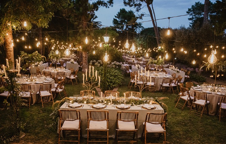 - Utiliza las guirnaldas micro-LED para los detalles de cercanía: envolviendo árboles, decorando la zona del buffet o iluminando el photocall (capa de textura).