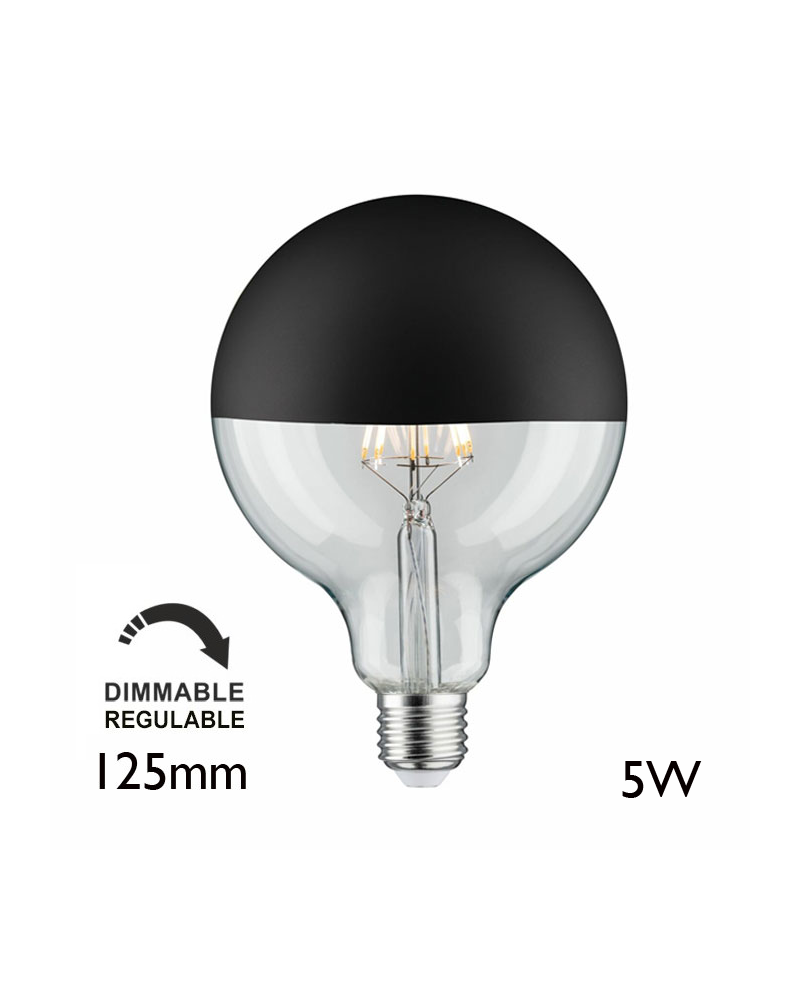 LED Globe 125 matt black dome 5W E27 emitting warm white light, The round LED lamp with a diameter of 125 mm and its modern black dome not only attracts attention decoratively, but also provides indirect light no glare. These types of bulbs are ideal for lighting mirrors or for use in suspended luminaires and table luminaires. Indirect light through its dome, made of high quality full glass. Dimmable. Color temperature: 2700K - Warm White