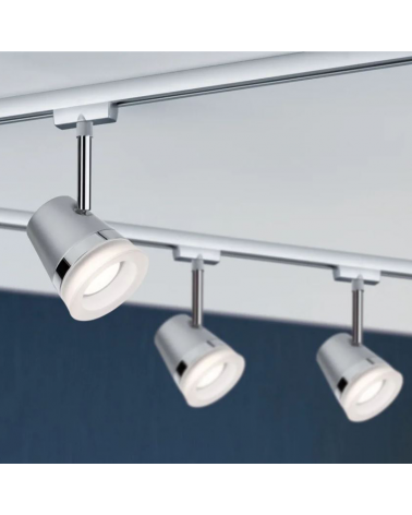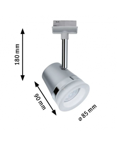 Adjustable spotlight for track or 8.5cm cylindrical base, with GU10 socket. Made of metal, matt chrome finish. Adjustable allowing to focus and project the light where it is preferred. URail system included. It offers great ease of installation and thus is a good alternative for commercial premises. They offer special lighting for any business and thus show your product more attractively.