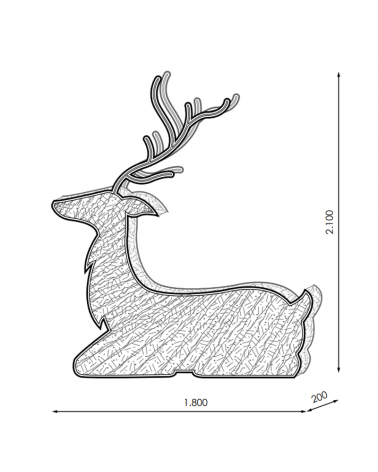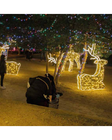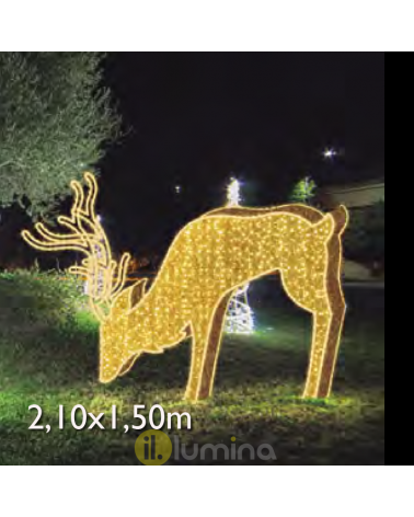 3D figure in the shape of a seated reindeer measures 180x210 cms. Illuminated with warm white led lights. Decorated with luminous tapestry. Being LED technology it only consumes 90W. Suitable for indoor and outdoor use, IP65.