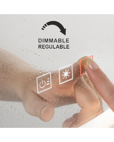 The round lighted mirror is perfect for use in wet bathrooms due to its splash-proof design. The mirror features touch switches to turn on and off, adjust light color and heating. Thanks to the WhiteSwitch function, the light color can be adjusted according to mood or time of day: White daylight: wake up! Neutral White – Makeup! Warm White – Relax! IP protection: IP44 protected against splashes with integrated LED bulb Color temperature: 2700K - Warm white - 6500K - Daylight white The touch control allows you to adjust the light intensity between 2700k and 6500k. It is located at the bottom edge of the mirror, in the center of its width. The touch switch also allows you to regulate the intensity of the light.