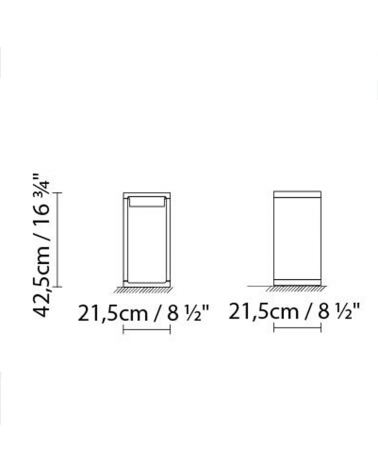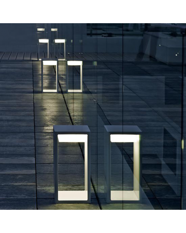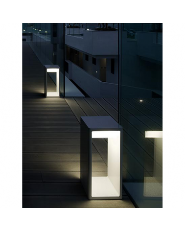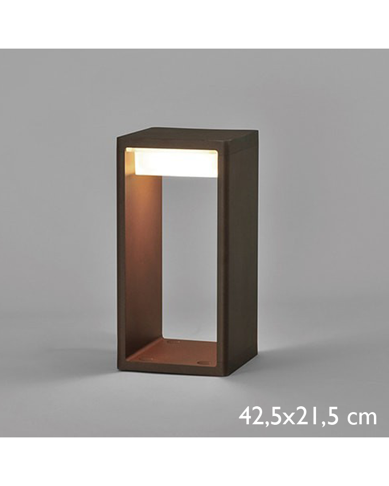 Outdoor beacon (IP54) hollow rectangular prism shape. Made of aluminum in white, bronze, charcoal gray and corten finishes. With a height of 42.5 cm, light temperature at 2700K. It intensely illuminates your inner void and asymmetrically the adjacent floor.