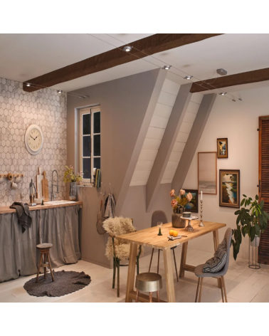 Complete kit with 5 LED spotlights included in matt white consisting of a transformer, cable, spotlights and installation instructions. Ideal for lighting large, angled spaces.
