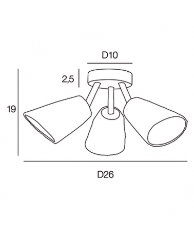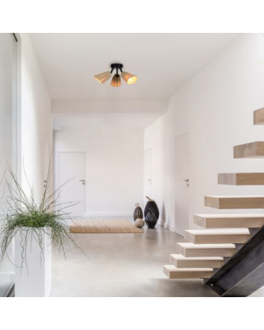Ceiling light with 3 boho-style spots, black finish metal base and conical-shaped appliques made of hand-woven natural raffia. The rotating spotlights to facilitate the positioning of the light. Made with ecological materials and without impact on the environment. Bulbs not included.