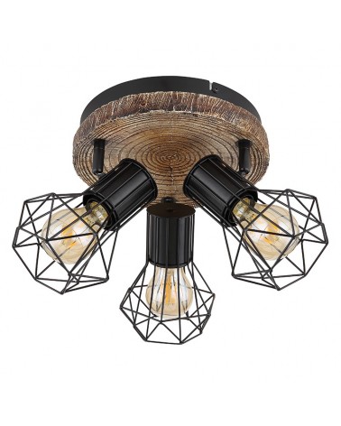 Industrial vintage circular ceiling lamp with 3 oscillating spotlights, black lampholder finish, imitation wood base, 3xE27 40W