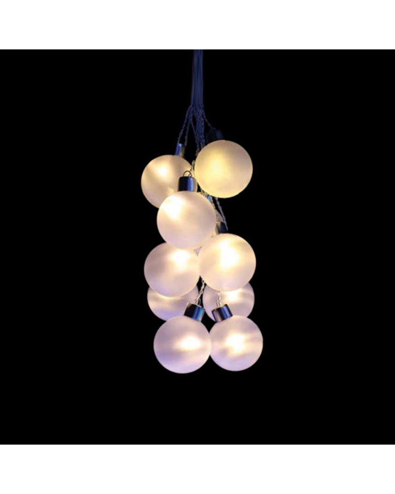 Christmas motif in the form of a cluster of 10 glass balls of 8cm in diameter each with LED lights available in warm light. Suitable for indoor use. Ideal for decorating shop windows, home environments, etc. Low voltage 3.2V. Consumption: only 0.96W.