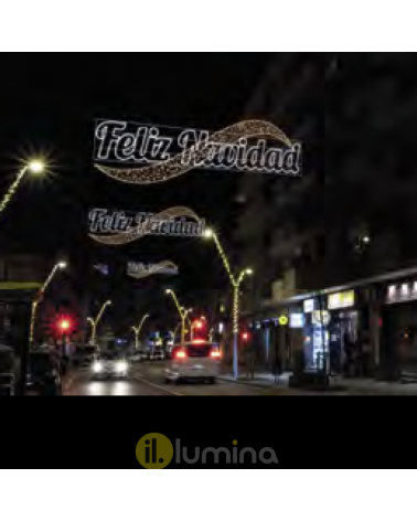 LED sign "FELIZ NAVIDAD" 6 meters long illuminated with cool white and warm white LEDs. Being LED technology it only consumes 579W. Suitable for indoor and outdoor use, IP65 & IP44 Plug. Made in Spain.