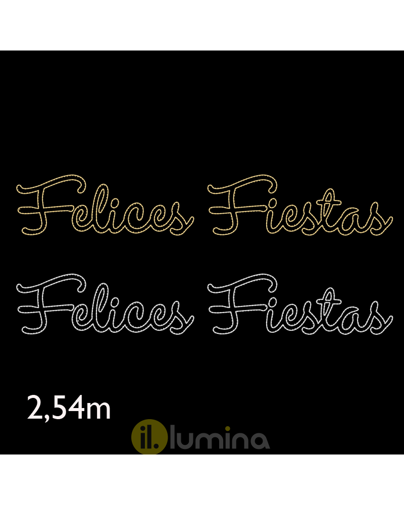 Led sign "FELICES FIESTAS", 2.67 meters long, illuminated with LEDs, available in warm white or cool white. Being LED technology it only consumes 48W. Suitable for indoor and outdoor use, IP65 & IP44 Plug. Made in Spain.