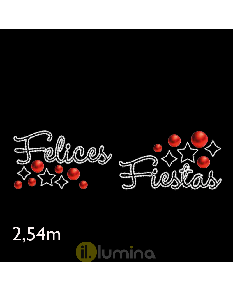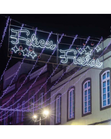 LED sign "FELICES FIESTAS" decorated with stars and balls 2.67 meters long illuminated with cool white light LEDs. Being LED technology it only consumes 57W. Suitable for indoor and outdoor use, IP65 & IP44 Plug. Made in Spain.