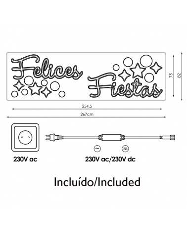 Ideal for facades, decorating streets, lampposts, balconies, decorating the end of garlands, etc. - Power cable included. - Luminous figure measurements: length 267 cm, height 82 cm. Weight: 8 Kgs. - Bulb type: LED technology. - Total consumption: only 57W. - IP65: Suitable for outdoor use. - Voltage: direct to 230V network.