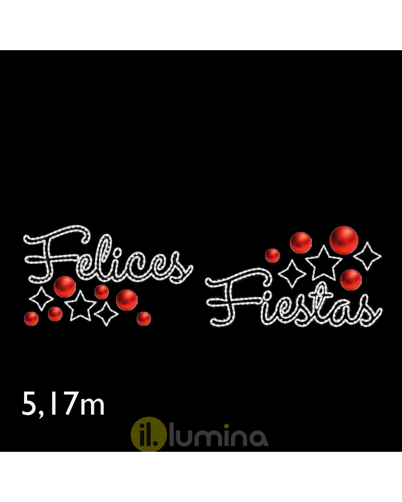 LED sign "FELICES FIESTAS" decorated with stars and balls of 5.30 meters long illuminated with cool white light LEDs. Being LED technology it only consumes 116W. Suitable for indoor and outdoor use, IP65 & IP44 Plug. Made in Spain.