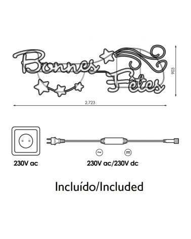 Led sign "BONNES FÊTES" with comet decoration of 2.72 meters long illuminated with cool white and warm white light LEDs. Being LED technology it only consumes 81W. Suitable for indoor and outdoor use, IP65 & IP44 Plug. Made in Spain.