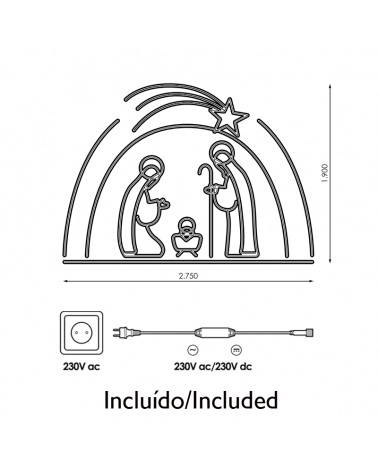 Ideal for facades, decorating streets, squares, town halls, large buildings, shopping centers, etc. - Power cable included. - Luminous figure measurements: length 275 cm, height 190 cm. Weight: 15 Kgs. - Bulb type: LED technology. - Total consumption: only 175W. - IP65: Suitable for outdoor use. - Voltage: direct to 230V network.
