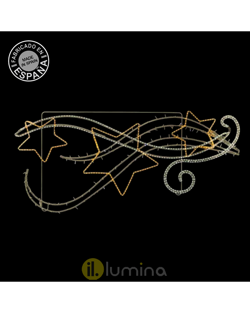 Beautiful decorative figure for Christmas lighting with curved shapes with three stars, available in two finishes in cool and warm light light or in blue and cool white. Suitable for facades, street lamps and streets. Being LED technology it only consumes 64W. Suitable for outdoor use, IP65 & IP44 Plug. Cable included. It can be combined with others to form street compositions. (See example photo) Made in Spain.