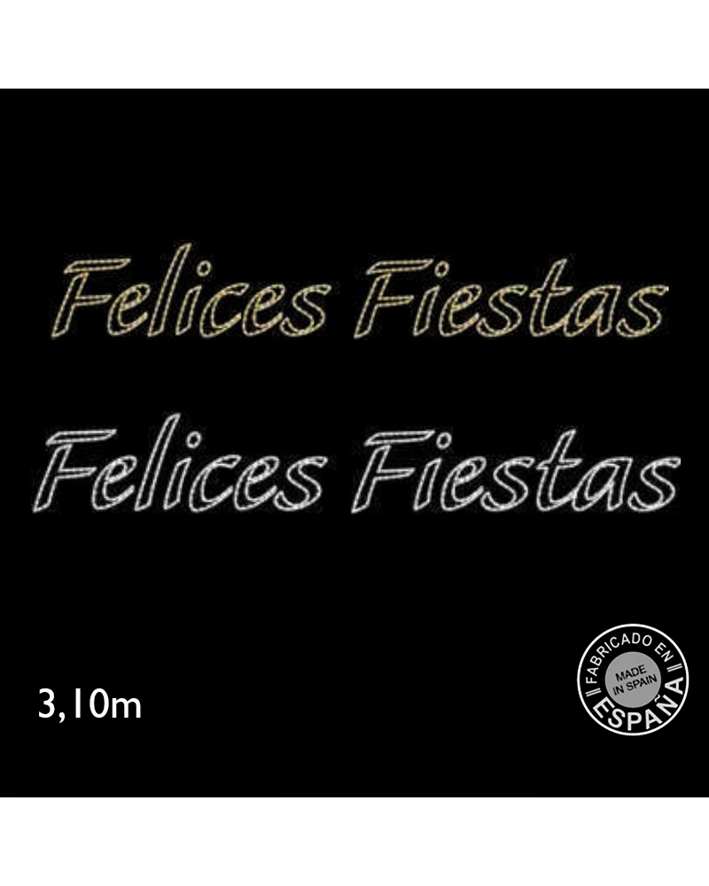 HAPPY HOLIDAYS LED banner 3.10 meters long, illuminated with LEDs, available in warm or cold white. Being LED technology, it only consumes 56W. Suitable for outdoor use, IP65 & IP44 Plug. Made in Spain.