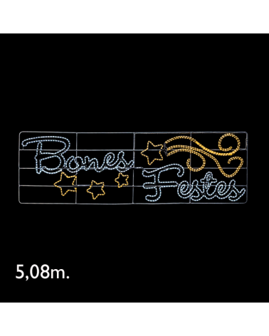 "BONES FESTES" led sign of 508cms illuminated with leds of warm colors and cool white. It measures 5.08 meters long. Being LED technology, it only consumes 156W. for outdoor use, IP65 & IP44 Plug.