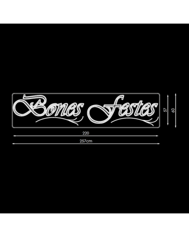 "BONES FESTES" LED sign, 220cm long, illuminated with cool white LEDs, with the words underlined in warm LEDs. It measures 2.2 meters long. Being LED technology, it only consumes 62W. for outdoor use, IP65 & IP44 Plug