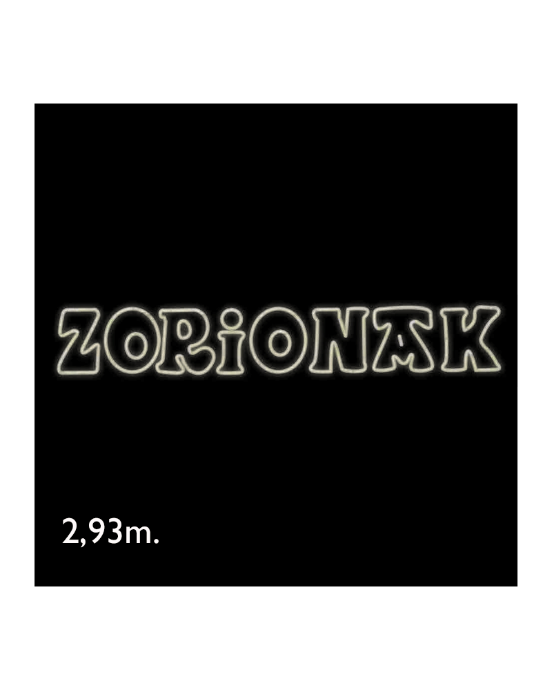 "Zorionak" double neon Basque led sign of 293.6cms illuminated with leds available in cool and warm white. As it is LED technology it only consumes 270W. for outdoor use, IP65 & IP44 Plug. It is supported by a 300x55cm structure.