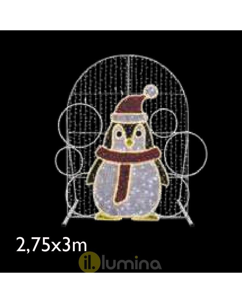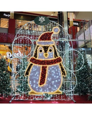 Space with penguin for selfie measures 275.3x301.1 cms. Illuminated with cool and warm white LEDs with flashing effect. Decorated with luminous tapestry of various colors. Being LED technology it only consumes 160W. Suitable for indoor and outdoor use, IP65.