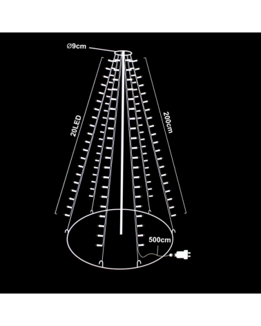Medidas: longitud de 5 metros; altura 2 metros. Lámparas: compuesta por 120 luces LED Número de tiras: 6. Leds por cada tira: 20. Cable negro. Apto para exteriores, IP44. Incluye transformador.