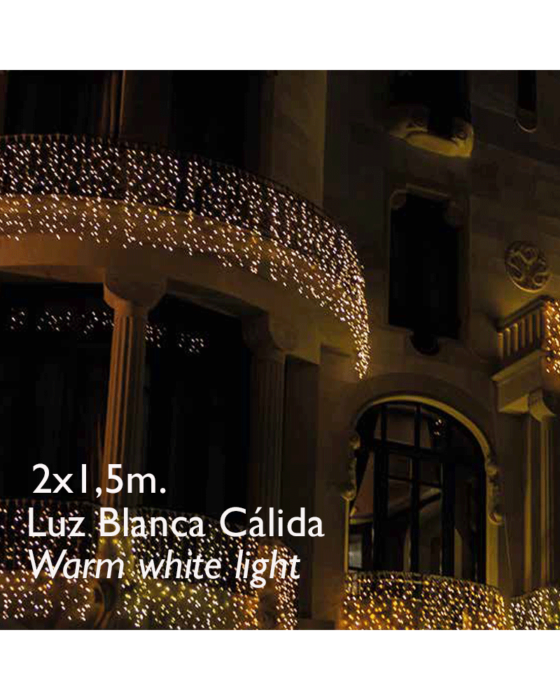 Curtain of LED lights for professional use, warm light available in black or white cable, connectable, suitable for exteriors, 2 meters long by 1.50 meters high. It has a total of 20 strips and 300 Led lights. Being LED it consumes only 30W. It is suitable for exteriors and is connectable, allowing up to 10 curtains to be connected together with a single plug.