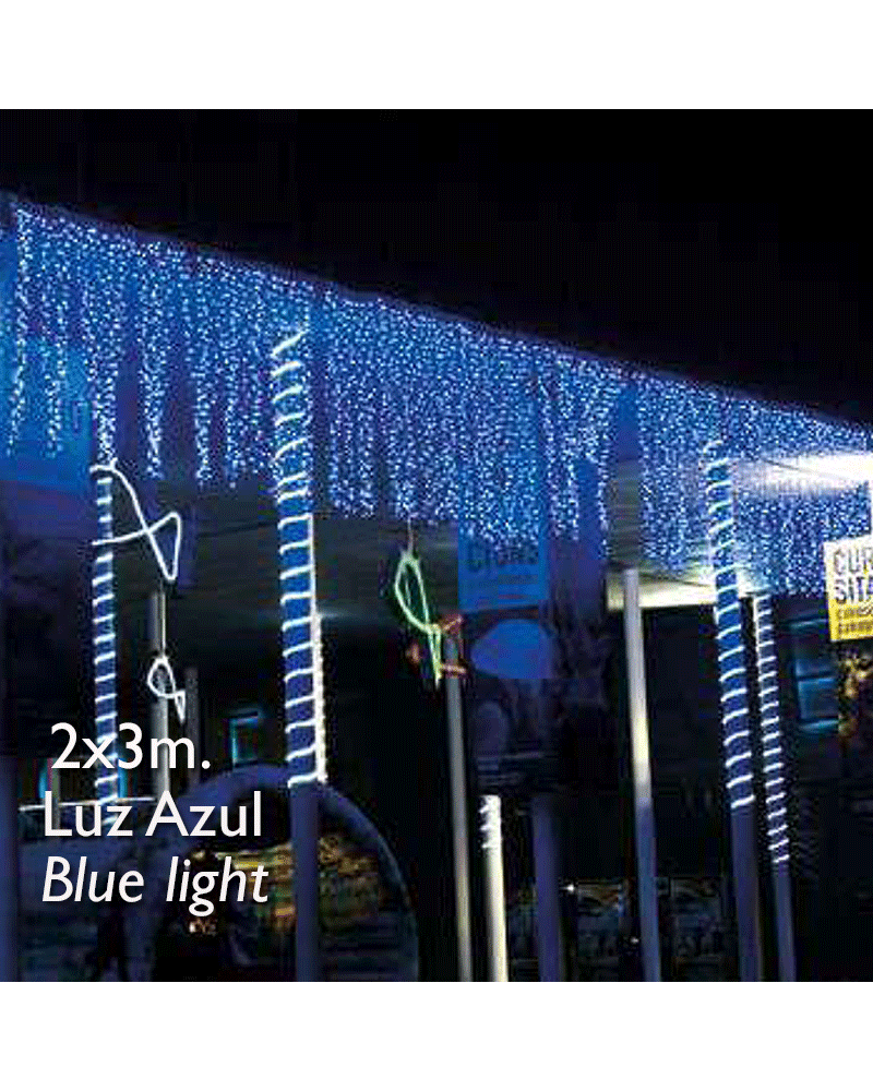 LED light curtain for professional use, blue light color, white cable, connectable and for outdoor use. It measures 2 meters long by 3 meters high. It has a total of 20 strips and 600 Led lights. Being LED it consumes only 35W. It is for outdoor use and is connectable, allowing up to 7 shades to be connected together with a single plug. Requires white power cable not included