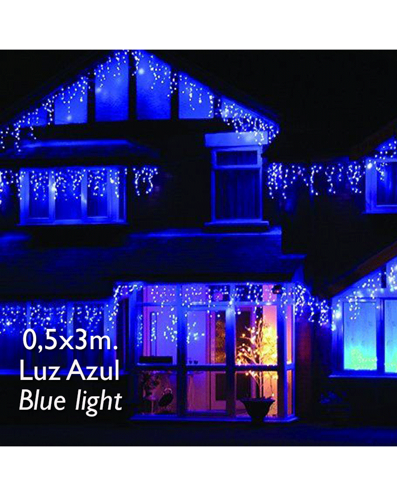 "Ice" type curtain with 114 blue light LED lamps, suitable for exteriors. It measures 3 meters wide by 0.5 meters high, and is made up of 2 segments of 1.5m wide that can be separated and operated independently. It is connectable: up to 20 curtains can be connected in a row with a single plug. You need white power cable not included.