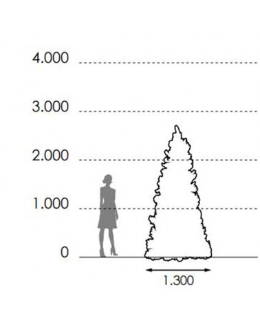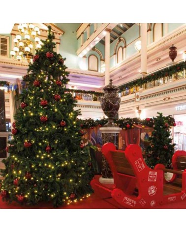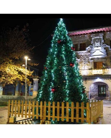Green Christmas tree. - Measurements: height 2.7 meters, diameter base 1.3 meters. - Floor support included. Inner post structure and safety fixing base with steel cable. - It can be illuminated with our linkable LED strings, also for outdoor use (See the "LED strings" family) or with LED curtains, LED cascades, LED nets. - This product is served disassembled, packed in 1 box. - Ideal for shopping centers, shops, squares and streets, gardens, hotels, etc.