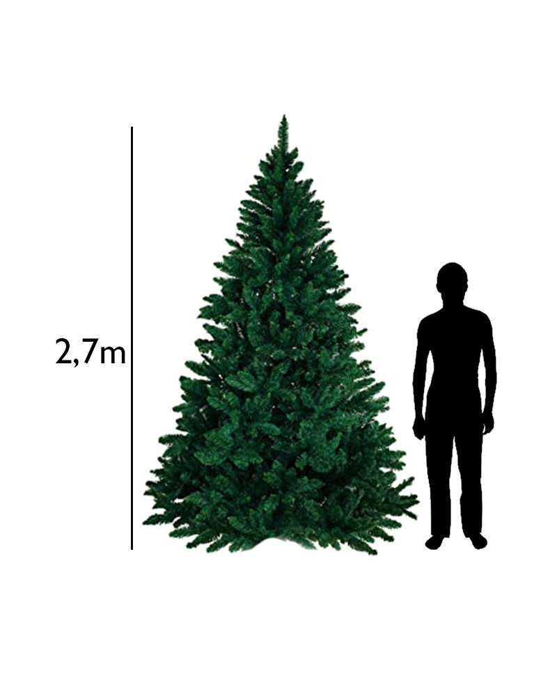 Green Christmas tree. Measurements: height 2.7 meters, diameter base 1.3 meters. Inner post structure and safety fixing base with steel cable. It can be decorated and illuminated with our linkable LED string lights, LED curtain lightss, LED waterfalls, Christmas balls, etc. It is served disassembled, packed in 1 box. Only the tree is served, without decoration.