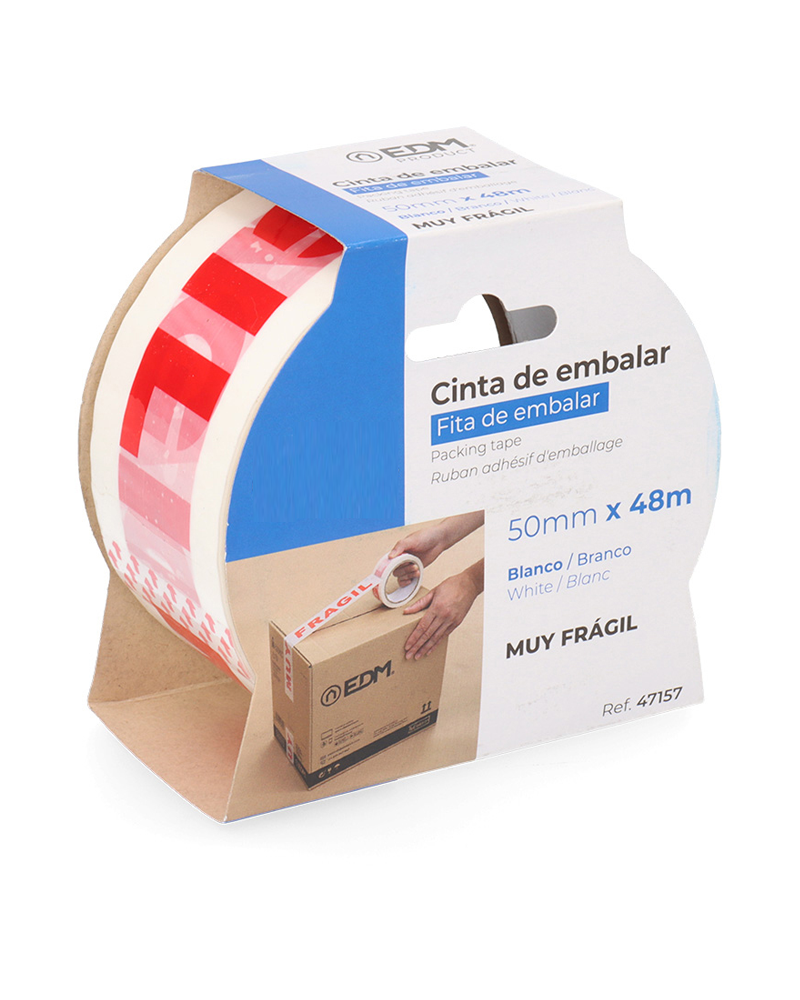 The "MUY FRAGIL" sealing tape is a product made of polypropylene, it is 50 meters long and 50mm wide. Its color is white and red.