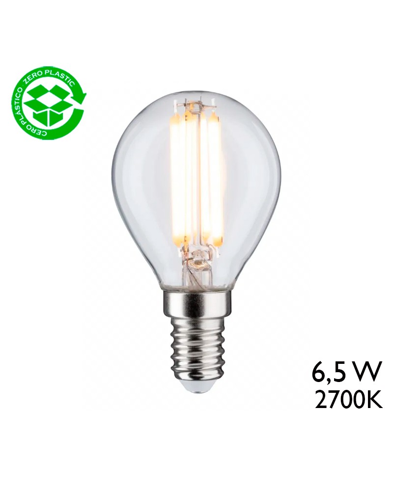 Vintage round bulb 45 mm. Clear LED filaments Dimmable E14 6.5W 2700K 806Lm.