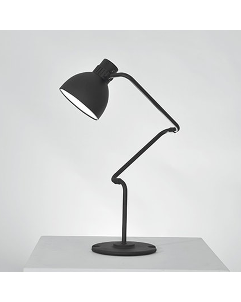Lámpara de mesa articulada de diseño inglés, sus articulaciones con una medida de 30 cm. La simplicidad de sus formas se manifiesta en sus articulaciones de fricción, así permite dirigir la iluminación a nuestro antojo. Con pantalla de aluminio en los siguientes acabados negro mate, rojo mate o beige mate, también disponible con pantallas en acabado latón y cobre con el cuerpo en negro y todos con el interior de la pantalla en blanco satinado. Como complemento contiene lámpara de pie de la misma familia.