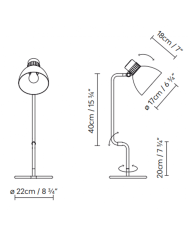 Lámpara de mesa articulada de diseño inglés, sus articulaciones con una medida de 40 cm. La simplicidad de sus formas se manifiesta en sus articulaciones de fricción, así permite dirigir la iluminación a nuestro antojo. Con pantalla de aluminio en los siguientes acabados negro mate, rojo mate o beige mate, también disponible con pantallas en acabado latón y cobre con el cuerpo en negro y todos con el interior de la pantalla en blanco satinado. Como complemento contiene lámpara de pie de la misma familia.