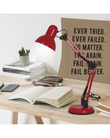Table lamp type flexo with current design available in red. Height adjustable, adjustable head. Ceramic E27 lamp holder. - ON/OFF switch included. - Measurements: Maximum height 41 cm. -Lamp: for 1 LED bulb, energy-saving or incandescent, maximum 40W, E27 thread, not included. - In addition to the round base, the lamp has a clip that allows you to attach it to the table.