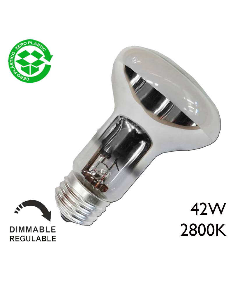 Clear reflector halogen bulb R90 42W with E27 thread. 2800K warm light. Dimmable and energy saving. Diameter: 90mm.