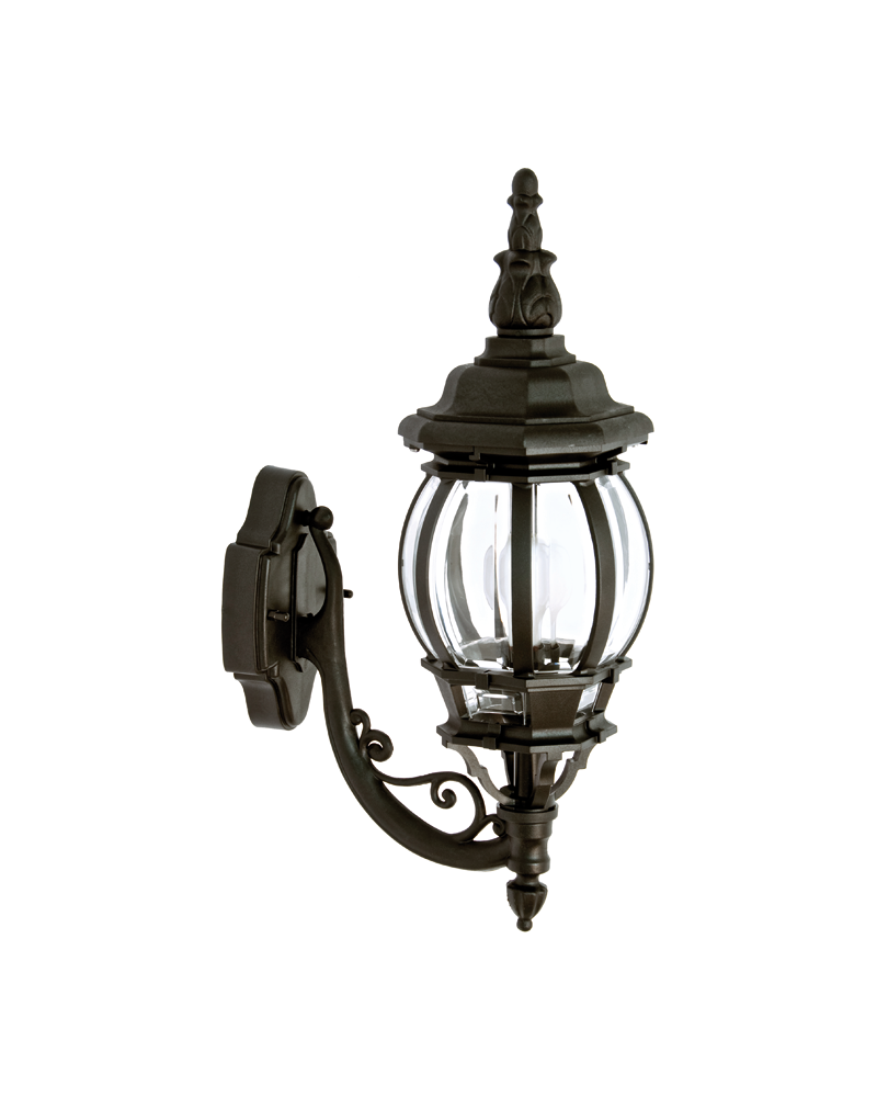 IP44 outdoor wall light for a 52cm high E27 socketed lamp, with an upwards head and UV resistant beveled polycarbonate diffuser. Available in black, dark green and rust brown.