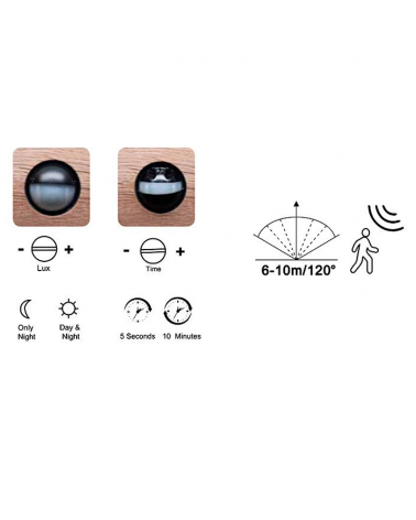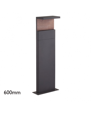 Elegant outdoor wall lamp made of aluminum with a dark grey finish and natural wood. Integrated 15W LED with 3000K warm light. With IP54 protection. It incorporates a presence sensor at a distance of between 6 to 10 meters and an angle of 120º. With day and night switch to prevent it from lighting up during the day. You can choose the timer between 5 and 10 minutes. Perfect for lighting walkways.