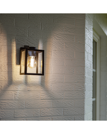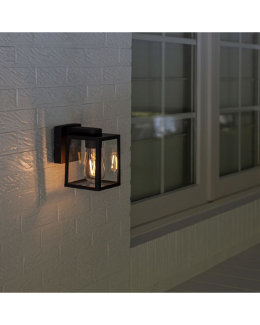 The outdoor wall light with a matt black finish, designed to provide effective lighting in outdoor spaces. With a height of 18.4cm, it is made of high-quality aluminum to guarantee its durability and resistance to adverse weather conditions and a transparent glass screen.